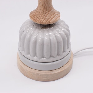説明:フランスの古い糸巻きと昔の日本家屋に使用されていた陶器ローゼットで製作したランプです。燭台のようなイメージで、キャンドルのような温かなあかりが灯されます。