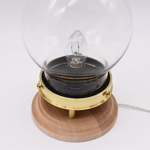 素材:ビンテージのガラスホヤ、真鍮、木円盤
