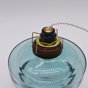 揺らぎのある透明ガラスにランプの灯が暖かく映ります。